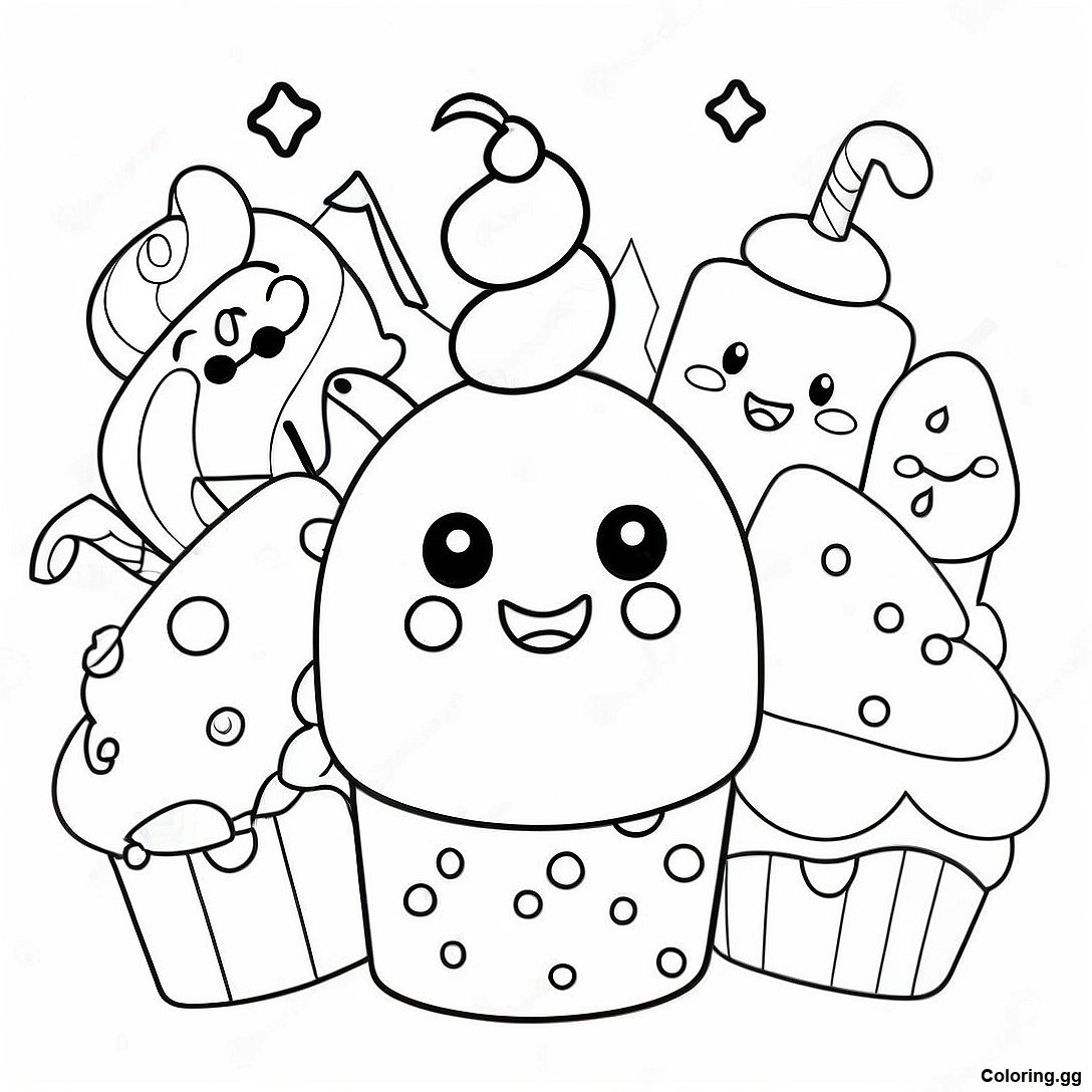 క్యూట్ నమ్ నామ్ కప్‌కేక్‌లతో రంగుల పేజీ