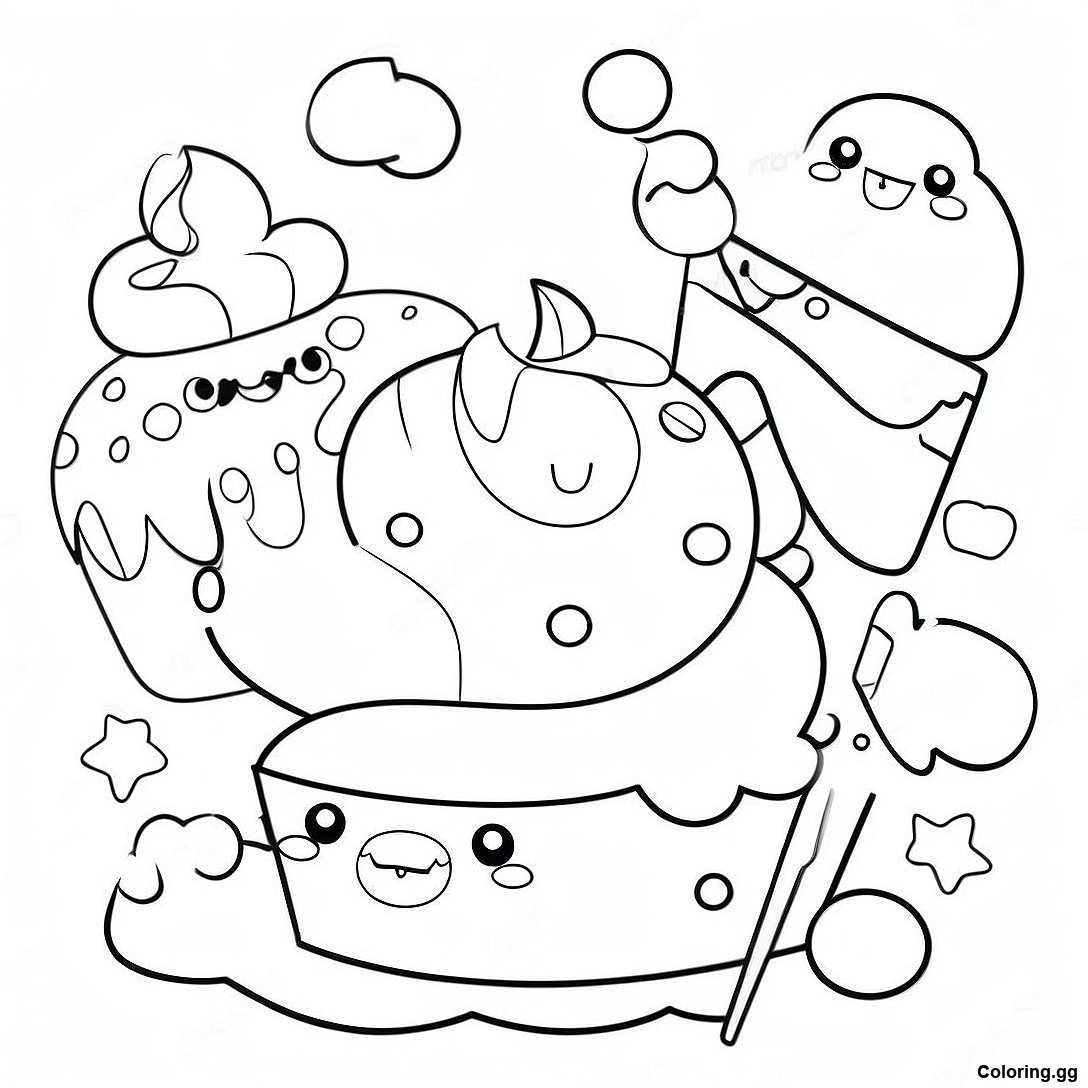 క్యూట్ నమ్ నామ్ కప్‌కేక్‌లతో రంగుల పేజీ